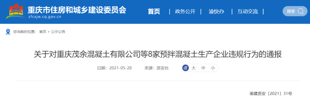 日前,重慶市住房和城鄉(xiāng)建設(shè)委員會(huì)發(fā)布《關(guān)于對(duì)重慶茂余混凝土有限公司等8家預(yù)拌混凝土生產(chǎn)企業(yè)違規(guī)行為的通報(bào)》稱, 按照《重慶市建設(shè)工程質(zhì)量飛行檢查工作方案》(渝建質(zhì)安〔2020〕28號(hào))要求,重慶市住房和城鄉(xiāng)建設(shè)委員會(huì)于近期對(duì)9個(gè)區(qū)縣16家預(yù)拌混凝土生產(chǎn)企業(yè)開(kāi)展了監(jiān)督抽查,抽查發(fā)現(xiàn)部分預(yù)拌混凝土生產(chǎn)企業(yè)在生產(chǎn)質(zhì)量管理過(guò)程中,違反相關(guān)法律、法規(guī)和工程建設(shè)強(qiáng)制性標(biāo)準(zhǔn)規(guī)定。
