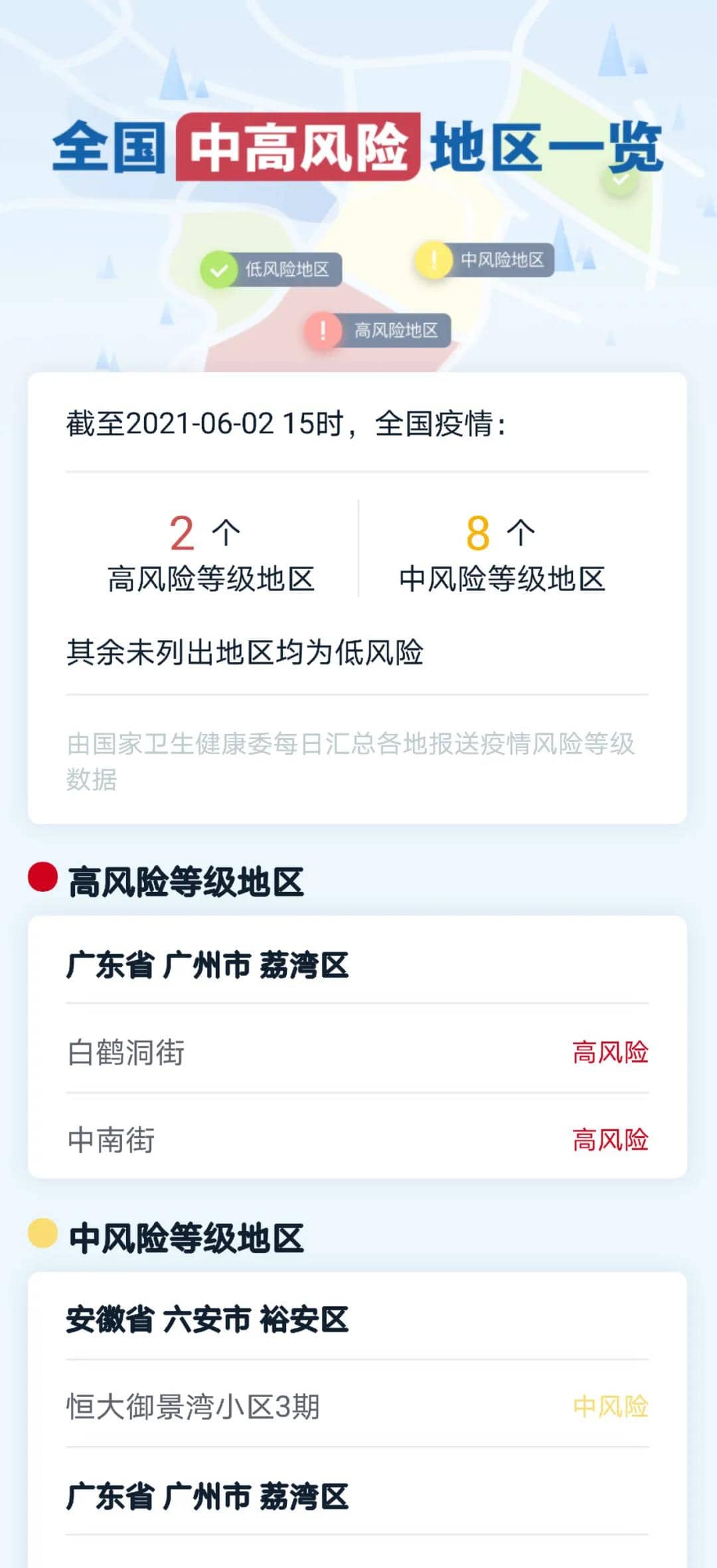 廣州市衛(wèi)生健康委員會官網(wǎng)6月2日凌晨發(fā)布消息稱,根據(jù)廣東省新冠肺炎防控指揮辦《關(guān)于印發(fā)廣東省應(yīng)對新型冠狀病毒肺炎疫情分區(qū)分級防控工作指引的通知》,經(jīng)廣州市新冠肺炎防控指揮部同意,自2021年6月2日起,廣州市部分區(qū)域疫情風(fēng)險等級調(diào)整如下: