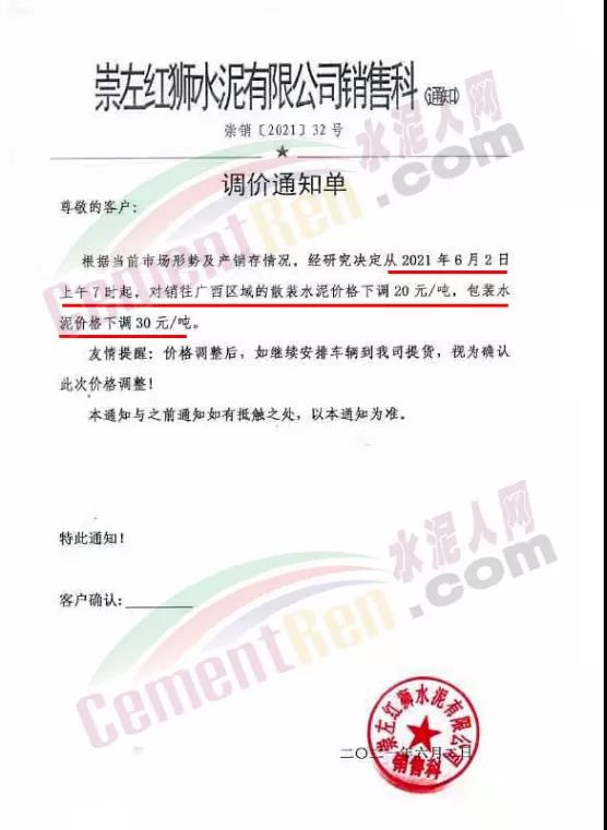 根據(jù)當(dāng)前市場形勢,經(jīng)研究決定,我公司于2021年6月2日07:00起對銷往廣西區(qū)域的散裝水泥價格下調(diào)20元/噸,包裝水泥價格下調(diào)30元/噸。