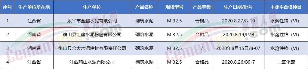 多區(qū)域通報水泥抽查不合格,涉及強度、水溶性鉻(VI)、燒失量、氯離子等