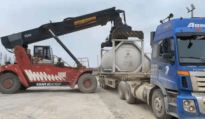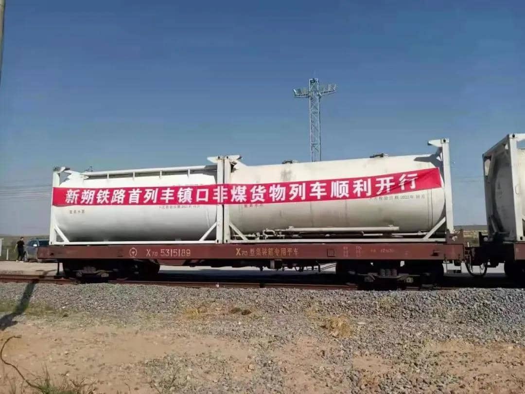 H30801次列車編組49輛N70型平車,裝載98個(gè)22N8型罐式集裝箱,在新朔鐵路二道河站組織裝車,經(jīng)大準(zhǔn)線-豐聯(lián)線-京包線運(yùn)輸,途徑呼鐵局、太原局、北京局,終到豐臺西站。
