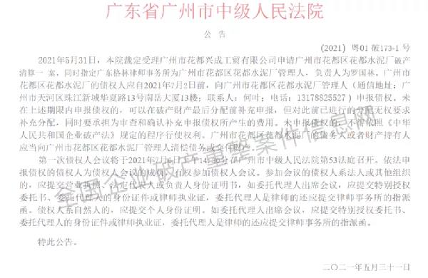 廣東省廣州市中級人民法院公告2021年5月31日,受理廣州花都興成工貿(mào)有限公司申請廣州市花都區(qū)花都水泥破產(chǎn)清算一案,同時指定廣東格林律師事務(wù)所為廣州市花都區(qū)花都水泥廠管理人。