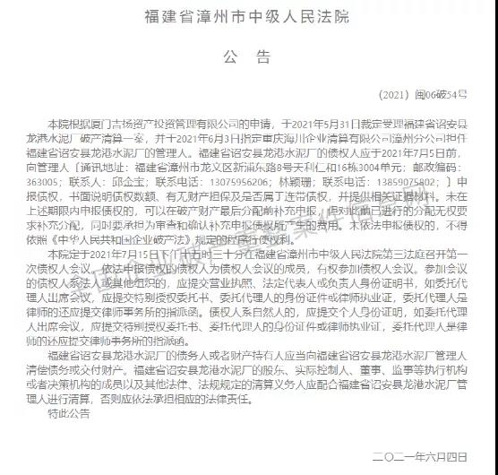 福建省漳州市中級人民法院公告于2021年5月31日裁定受理福建省詔安縣龍港水泥廠破產(chǎn)清算一案,并于2021年6月3日指定重慶海川企業(yè)清算有限公司漳州分公司擔任福建省詔安縣龍港水泥廠的管理人。