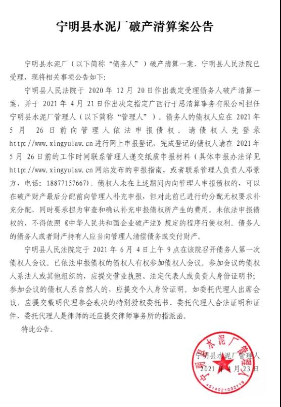 寧明縣水泥廠破產(chǎn)清算案公告提到,寧明縣水泥廠破產(chǎn)清算一案,寧明縣人民法院已受理。寧明縣人民法院于2020年12月20日作出裁定受理債務(wù)人破產(chǎn)清算一案,并于2021年4月21日作出決定指定廣西行于思清算事務(wù)有限公司擔任寧明縣水泥廠管理人。