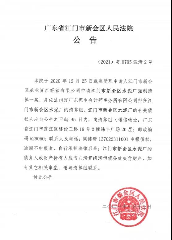 廣東省江門市新會區(qū)人民法院公告,已經(jīng)于2020年12月25日裁定受理申請人江門市新會區(qū)基業(yè)資產(chǎn)經(jīng)營有限公司申請江門市新會區(qū)水泥廠強制清算一案,并依法指定廣東恒生會計師事務(wù)所有限公司擔任江門市新會區(qū)水泥廠的清算組。