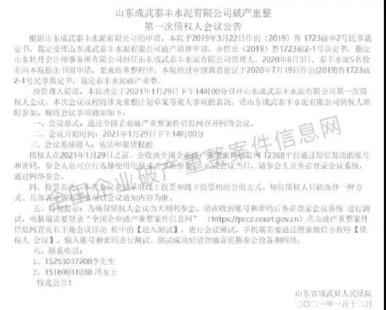 山東成武泰豐水泥有限公司破產(chǎn)重整第一次債權(quán)會議公告顯示,根據(jù)企業(yè)申請,山東省成武縣人民法院于2019年3月22日裁定受理企業(yè)破產(chǎn)清算申請,并作出決定書指定山東牡丹會計事務(wù)所有限公司擔任企業(yè)管理人。
