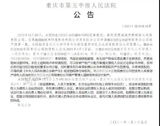 重慶第五中級人民法院公告,2020年12月28日,裁定刯海城市特新耐火材料有限公司、后英集團海城市環(huán)??萍加泄鹃_發(fā)區(qū)分公布申請重慶市巨立水泥有限公司破產(chǎn)清算案,指定重慶天億律師事務(wù)所擔任重慶市巨立水泥有限責任管理人。