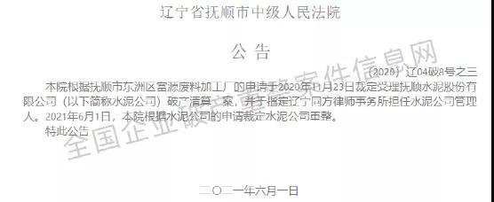 遼寧扶省撫順市中級人民法院公司,于2020年11月23日裁定受理撫順水泥股份有限公司破產(chǎn)清算一案,并指定遼寧同方律師事務(wù)所擔任水泥公司管理人。