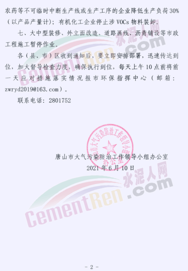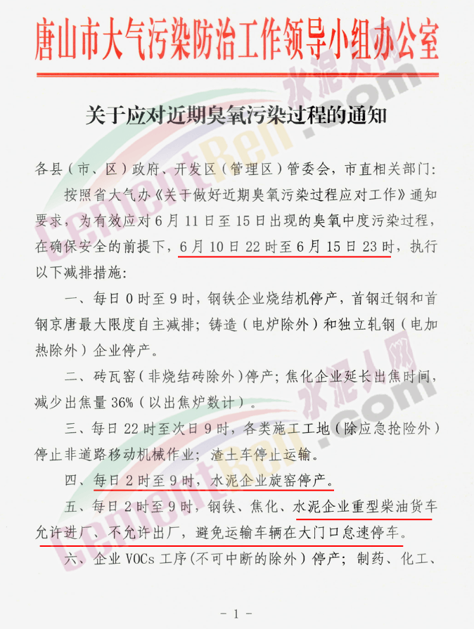 日前,唐山市大氣污染防治工作領(lǐng)導(dǎo)小組辦公室發(fā)布《關(guān)于應(yīng)對近期臭氧污染過程的通知》給轄區(qū)各縣(市、區(qū))政府、開發(fā)區(qū)(管理區(qū))管委會,市直相關(guān)部門稱,按照省大氣辦《關(guān)于做好近期臭氧污染過程應(yīng)對工作》通知要求,為有效應(yīng)對6月 11日至 15 日出現(xiàn)的臭氧中度污染過程,在確保安全的前提下,6月10日 22時至6月15日 23時,每日 2 時至 9 時,水泥企業(yè)旋窯停產(chǎn);每日 2 時至 9 時,鋼鐵、焦化、水泥企業(yè)重型柴油貨車允許進(jìn)廠、不允許出廠,避免運(yùn)輸車輛在大門口怠速停車。