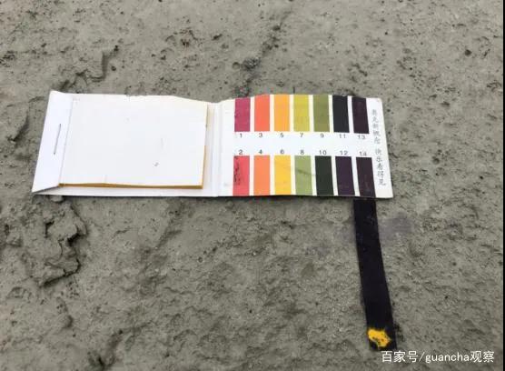 6月2日,在天津市靜海區(qū)調(diào)查時發(fā)現(xiàn),位于同合公司廠區(qū)緊鄰的路邊,在路邊上有一片,充斥著大量的水泥結(jié)塊、灰渣,大量被傾倒后已經(jīng)凝固的混凝土漿還保留著之前的流動形態(tài)?;炷翝{中的水分滲出后,都聚在路邊的低洼處。在剛傾倒過不久的一堆混凝土漿中,經(jīng)PH試紙檢測顯示其濃度堿液PH值在13—14左右。