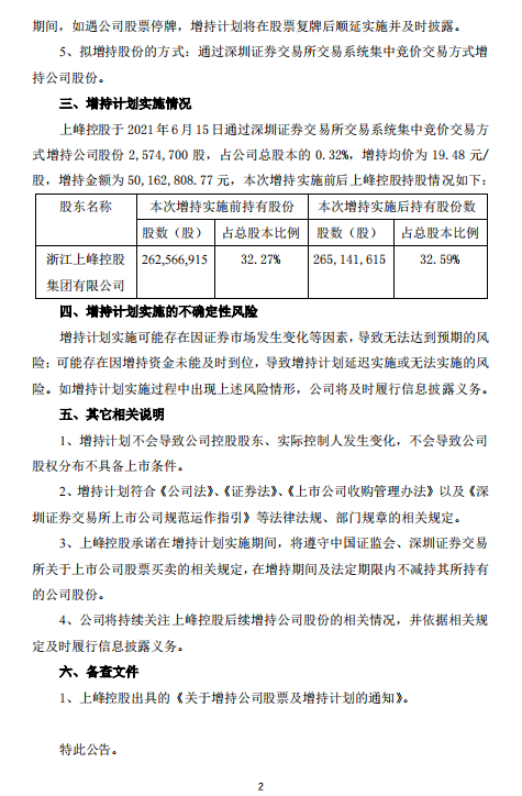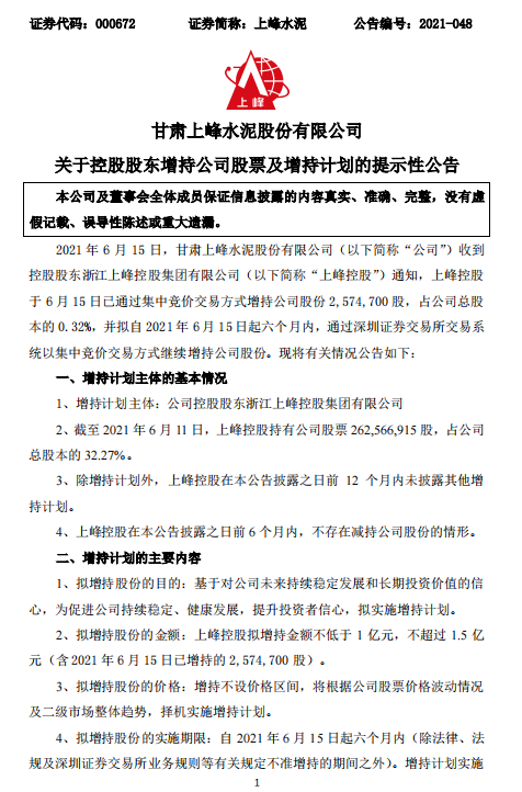 6月15日晚間上峰水泥公告,控股股東浙江上峰控股集團增持公司股份2,574,700股,并發(fā)布了擬增持1~1.5億元的增持計劃。大股東增持有力彰顯了對公司的發(fā)展信心。