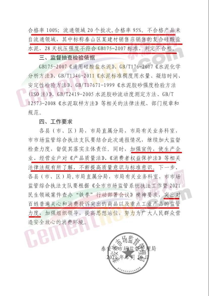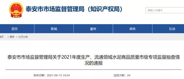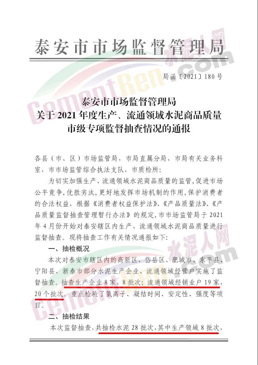 日前,山東省泰安市市場(chǎng)監(jiān)督管理局發(fā)布關(guān)于2021年度生產(chǎn)、流通領(lǐng)域水泥商品質(zhì)量市級(jí)專項(xiàng)監(jiān)督抽查情況的通報(bào)。