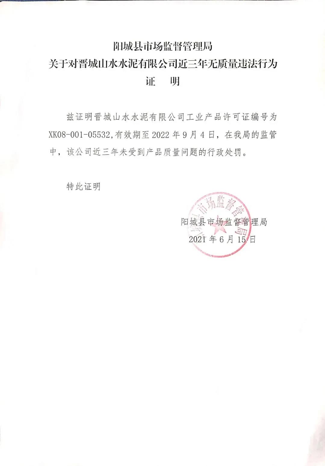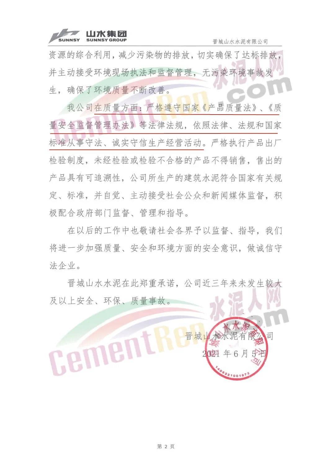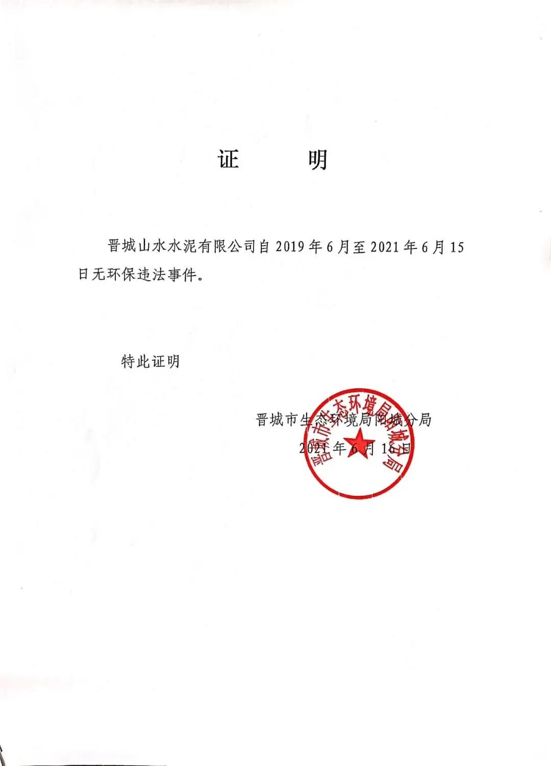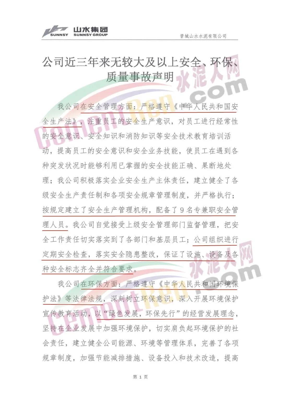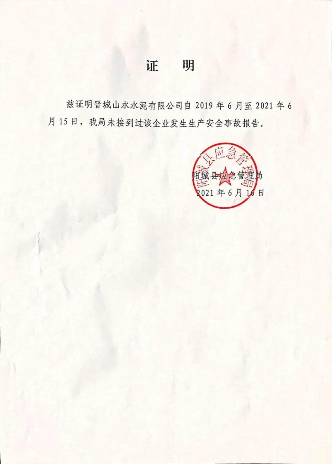 日前,晉城山水水泥有限公司發(fā)布《近三年來無較大及以上安全、環(huán)保、質(zhì)量事故聲明》稱,