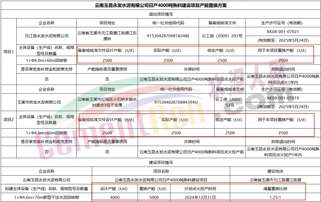 6月22日,云南省工信廳發(fā)布《云南玉昆永發(fā)水泥有限公司日產(chǎn)4000噸熟料建設(shè)項目產(chǎn)能置換方案公示》稱,按照相關(guān)文件要求,現(xiàn)將元江縣永發(fā)水泥有限公司2500t/d、玉溪市橋龍水泥有限公司2500t/d水泥熟料生產(chǎn)線以1.25:1的比例減量置換至云南玉昆永發(fā)水泥有限公司用于新建一條4000t/d熟料項目,計劃2024年12月31日點火。公示期為2021年6月23日至7月6日。具體公示如下: