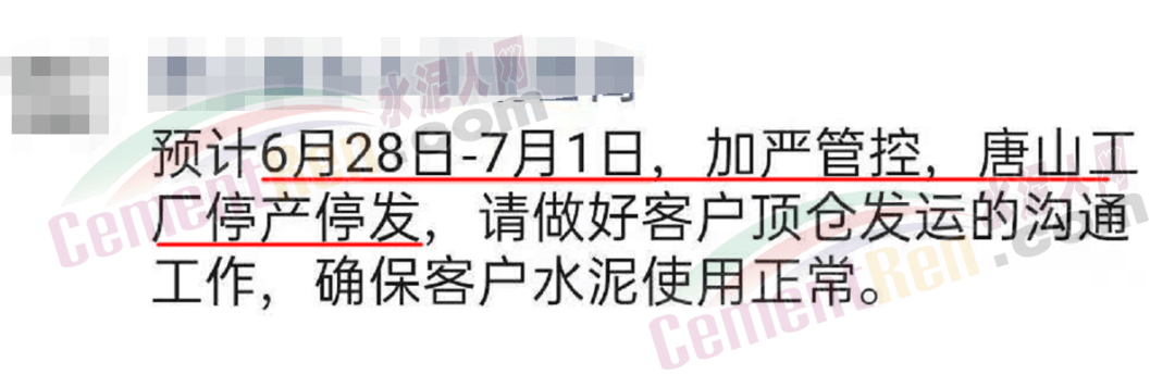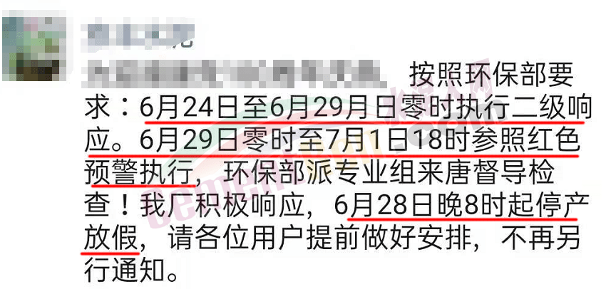 日前,唐山一家水泥企業(yè)發(fā)通知稱,按照環(huán)保部門要求:6月24日至6月29日零時(shí)執(zhí)行二級響應(yīng)。6月29日零時(shí)至7月1日18時(shí)參照紅色預(yù)警執(zhí)行,環(huán)保部門派專業(yè)組到唐山督導(dǎo)檢查!工廠積極響應(yīng),6月28日晚8時(shí)起停產(chǎn)放假,請用戶提前做好安排,不再另行通知。