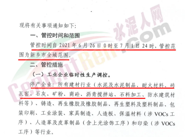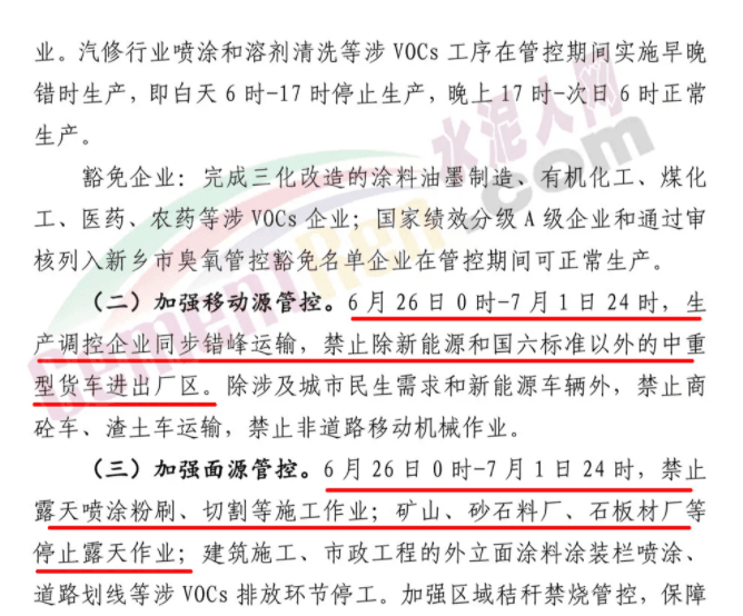 新鄉(xiāng)市全域范圍自6月26日0時(shí)至7月1日24時(shí)包括水泥及水泥制品在內(nèi)的所有建材行業(yè)停產(chǎn),生產(chǎn)調(diào)控企業(yè)同步錯(cuò)峰運(yùn)輸,禁止除新能源和國六標(biāo)準(zhǔn)以外的中重型貨車進(jìn)出廠區(qū),礦山、砂石料廠、石板材廠等停止露天作業(yè)。