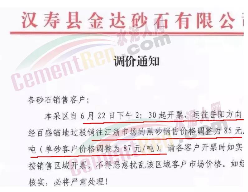 湖南省漢壽縣金達(dá)砂石有限公司發(fā)布調(diào)價通知,自6月22日下午2:30起開票,運往岳陽方向經(jīng)百盛錨地過駁銷往江浙市場的黑砂銷售價格調(diào)整為85元/噸(單砂客戶價格調(diào)整為87元/噸)。