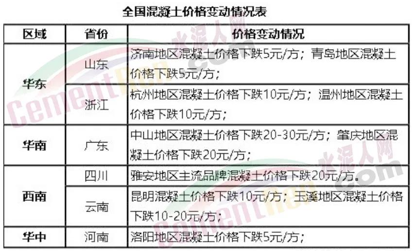 混凝土價格方面,上周全國混凝土價格繼續(xù)下跌,華東區(qū)域原材行情弱勢,價格小幅下跌;華南區(qū)域原材下跌,混凝土價格下行;華北區(qū)域市場需求疲軟,價格穩(wěn)中偏弱運行;華中區(qū)域成本降低,混凝土價格持穩(wěn)運行;西南區(qū)域原材料價格下行,商混價格小幅下跌;東北區(qū)域原材價格上漲,價格偏強運行;西北區(qū)域原材價格回落,市場價格暫穩(wěn)。