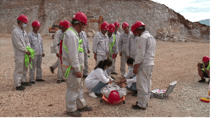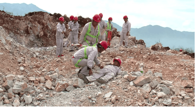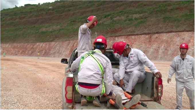 事故模擬礦山2327-2339平臺(tái)進(jìn)行爆破作業(yè)后,爆破員楊某和袁某準(zhǔn)備對(duì)爆堆進(jìn)行爆后安全檢查,兩人一前一后走向爆堆,就在此時(shí),楊某所在平臺(tái)區(qū)域突然發(fā)生溶洞坍塌,由于事發(fā)突然躲避不及,楊某隨塌陷區(qū)域掉入溶洞,右腳被壓無(wú)法移動(dòng),右腳小腿有出血現(xiàn)象,由于出血量多,傷員逐漸進(jìn)入昏迷狀態(tài),需迅速救治。見(jiàn)此狀況,袁某認(rèn)真查看了現(xiàn)場(chǎng)情況,對(duì)傷者楊某簡(jiǎn)單安慰后立即將事故現(xiàn)場(chǎng)情況報(bào)告給值班領(lǐng)導(dǎo)。公司調(diào)度員和值班領(lǐng)導(dǎo)接到報(bào)告后,立即啟動(dòng)《礦山溶洞坍塌事故應(yīng)急救援預(yù)案》,并按各自職責(zé)組織相關(guān)人員,成立臨時(shí)應(yīng)急救援小組,趕赴事發(fā)現(xiàn)場(chǎng),進(jìn)行應(yīng)急救援處置。救援小組人員到達(dá)現(xiàn)場(chǎng)后,警戒小組立即在坍塌區(qū)域范圍內(nèi)進(jìn)行警戒,禁止人員、設(shè)備靠近。由現(xiàn)場(chǎng)指揮組織技術(shù)人員對(duì)溶洞進(jìn)行勘察、評(píng)估,擬定救援方案。同時(shí)參加救援的應(yīng)急救援組、醫(yī)療救護(hù)組、善后保障組根據(jù)救援方案,立即展開(kāi)救援。整個(gè)演練過(guò)程,各參演小組聽(tīng)從指揮,統(tǒng)一行動(dòng),快速反應(yīng),分工協(xié)作,順利完成了緊急疏散、信息報(bào)告、現(xiàn)場(chǎng)警戒、現(xiàn)場(chǎng)搶險(xiǎn)救援、醫(yī)療急救、檢測(cè)保障等工作,直至應(yīng)急響應(yīng)終止,達(dá)到了應(yīng)急演練的預(yù)期目的。