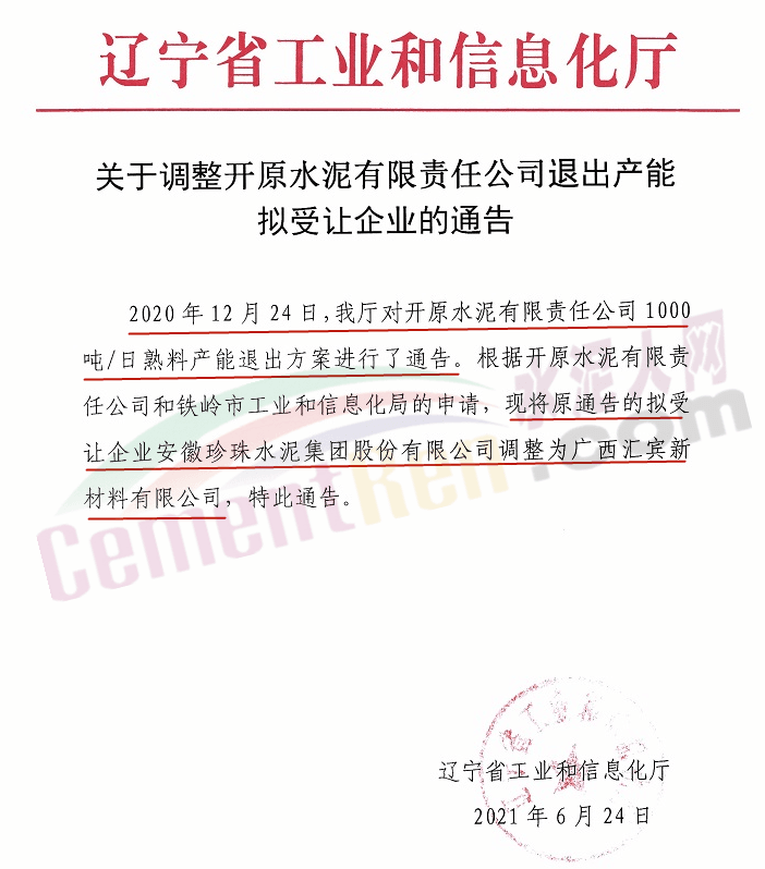 日前,遼寧省工業(yè)和信息化廳發(fā)布《關(guān)于調(diào)整開原水泥有限責(zé)任公司退出產(chǎn)能擬受讓企業(yè)的通告》將開原水泥有限責(zé)任公司1000t/d熟料產(chǎn)能的原擬受讓企業(yè)安徽珍珠水泥集團股份有限公司調(diào)整為廣西匯賓新材料有限公司。具體通告如下: