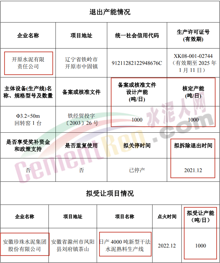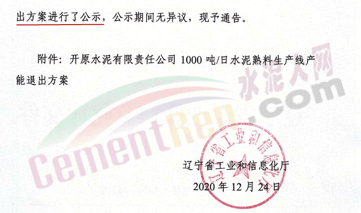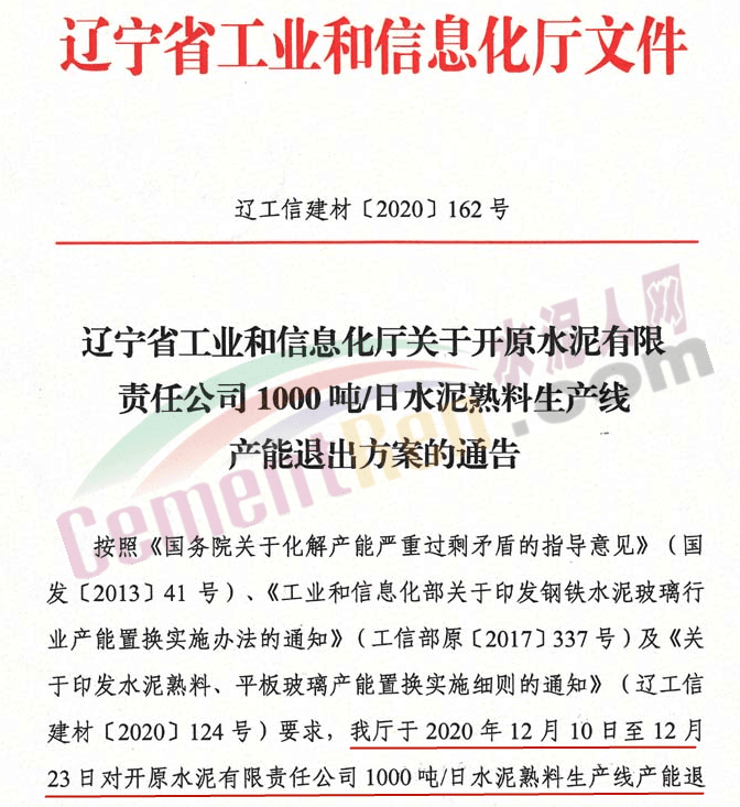 據(jù)水泥人網(wǎng)了解,2020年12月24日,遼寧省工業(yè)和信息化廳發(fā)布《關(guān)于開原水泥有限責(zé)任公司1000噸/日水泥熟料生產(chǎn)線產(chǎn)能退出方案的通告》稱,按照相關(guān)文件要求,將開原水泥有限責(zé)任公司1000t/d水泥熟料產(chǎn)能置換至安徽安徽珍珠水泥集團股份有限公司用于新建一條4000t/d新型干法水泥熟料生產(chǎn)線。具體通告如下: