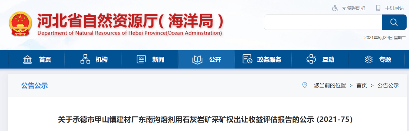 2021年6月28日,河北自然資源廳公示了承德市甲山鎮(zhèn)建材廠(chǎng)東南溝熔劑用石灰?guī)r礦采礦權(quán)出讓收益評(píng)估報(bào)告,如下: