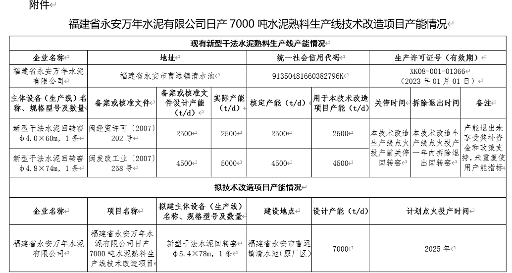 附件:福建省永安萬年水泥有限公司日產(chǎn)7000噸水泥熟料生產(chǎn)線技術(shù)改造項(xiàng)目產(chǎn)能情況