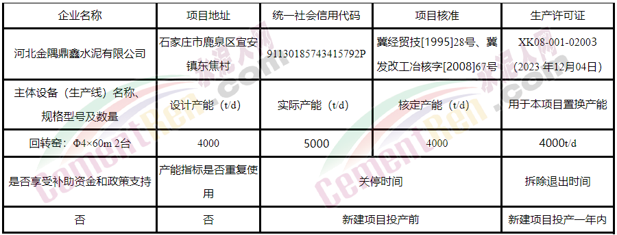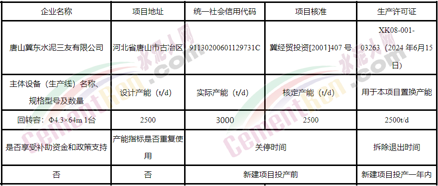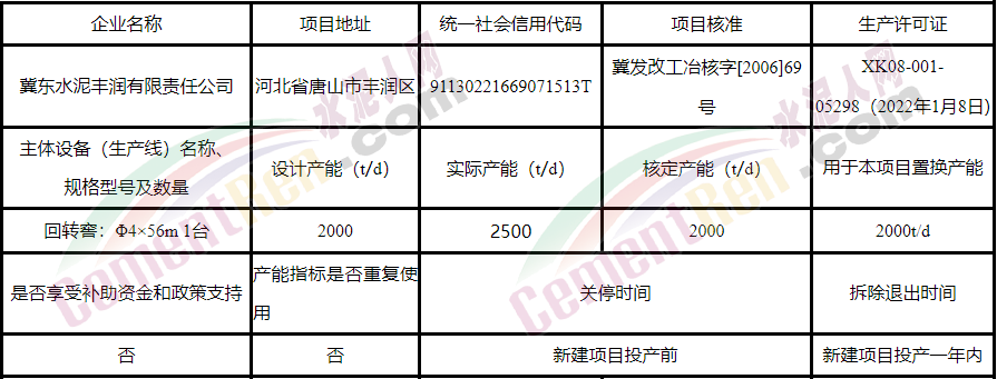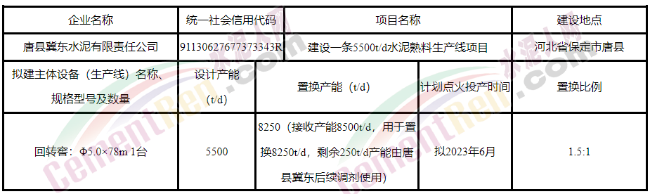 冀東水泥有限責任公司產(chǎn)能置換方案公示》將退出冀東水泥豐潤有限責任公司一條2000t/d生產(chǎn)線、唐山冀東水泥三友有限公司一條2500t/d生產(chǎn)線、河北金隅鼎鑫水泥有限公司一條4000t/d生產(chǎn)線,合計約255萬噸產(chǎn)能,用于唐縣冀東水泥有限責任公司新建一條5500t/d水泥