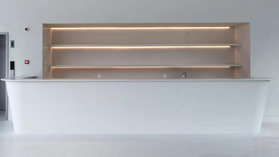 華潤水泥人造石具有良好的加工性,數(shù)十條近四米高的圓角方柱,由華潤水泥人造石“嘉興白”整體包裹,與鋁板天花、地面連成一片白色,將整個空間襯托的明亮整潔。