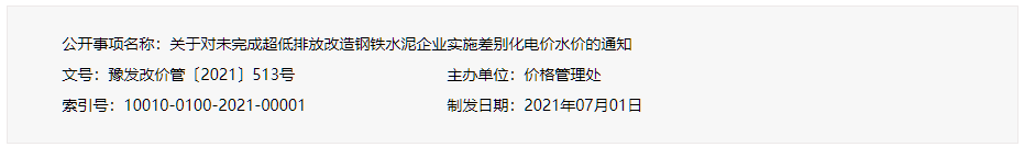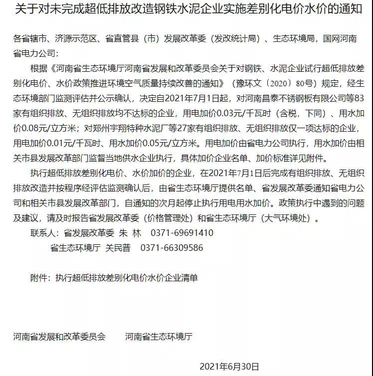 水泥企業(yè)實施差別化電價水價的通知》。根據通知,河南省發(fā)改委決定自2021年7月1日起,對河南昌泰不銹鋼板有限公司等83家有組織排放、無組織排放均不達標的企業(yè),用電加價0.03元/千瓦時、用水加價0.08元/立方米;對鄭州宇翔特種
