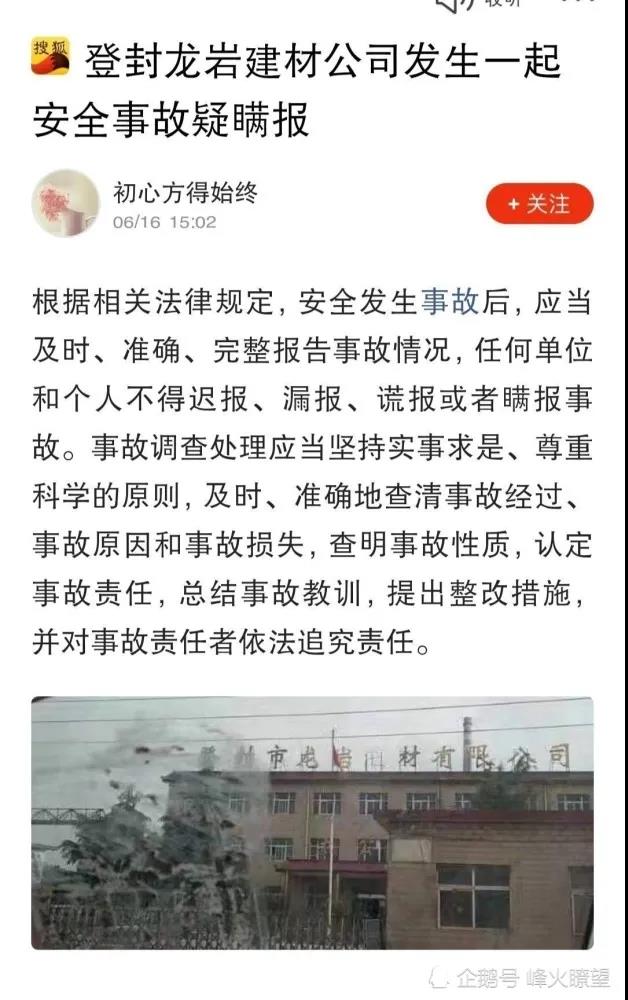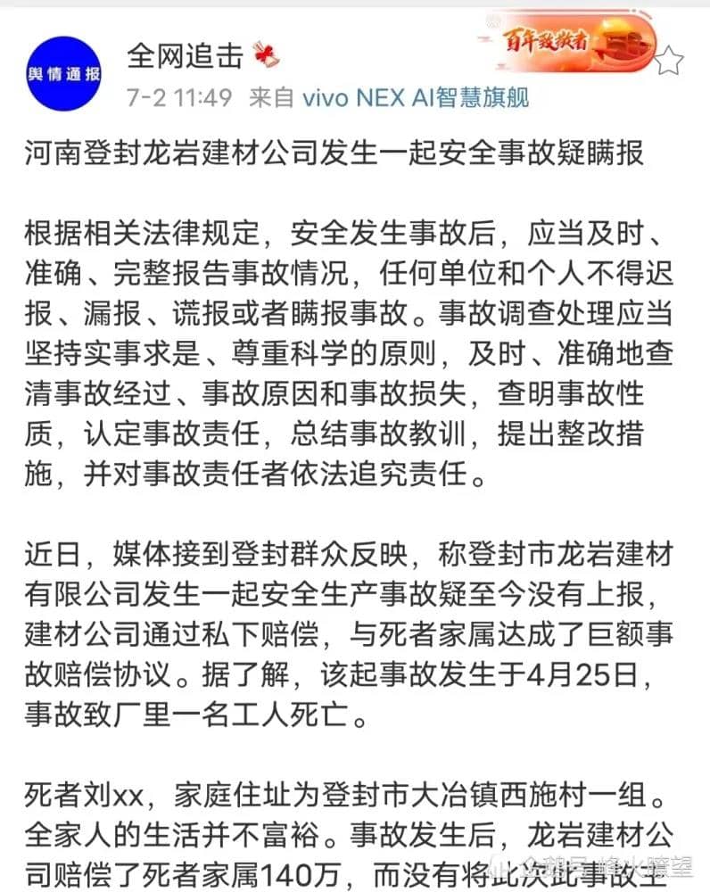 死者劉xx,家庭住址為登封市大冶鎮(zhèn)西施村一組。全家人的生活并不富裕。事故發(fā)生后,龍巖建材公司賠償了死者家屬140萬,而沒有將此次此事故主動上報政府部門,存在瞞報安全生產(chǎn)事故嫌疑。
