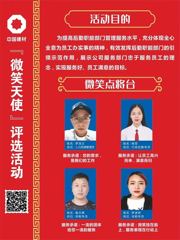 后勤工作不僅僅是嚴(yán)謹(jǐn)嚴(yán)肅的,更應(yīng)該是暖心的。為提升公司后勤職能部門服務(wù)質(zhì)量,強(qiáng)化員工服務(wù)意識(shí),更好的展現(xiàn)后勤人員的風(fēng)采和魅力,真正做好為員工辦實(shí)事工作。7月1日,貴州中誠(chéng)水泥開(kāi)展了“微笑天使”評(píng)選活動(dòng)。