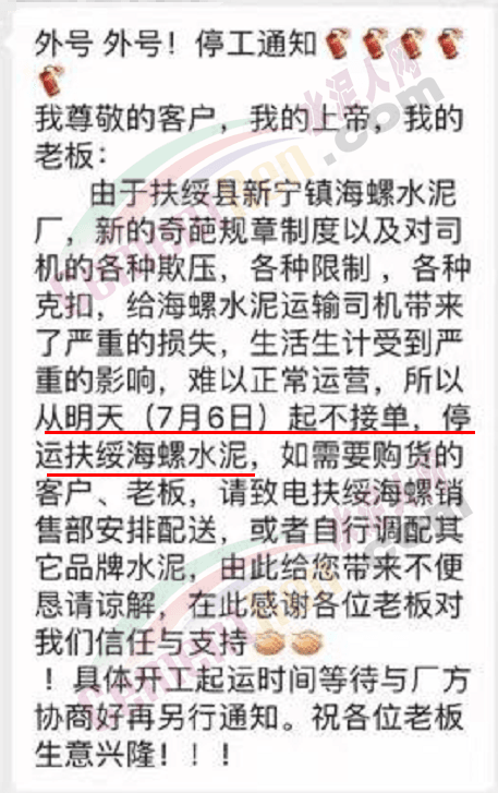 日前,有物流司機(jī)在群里發(fā)通知消息稱:“由于扶綏縣新寧鎮(zhèn)海螺水泥廠,新的奇葩規(guī)章制度以及對司機(jī)的各種欺壓,各種限制,各種克扣,給海螺水泥運(yùn)輸司機(jī)帶來了嚴(yán)重的損失,生活生計(jì)受到嚴(yán)重的影響,難以正常運(yùn)營,所以從7月6日起不接單,停運(yùn)扶綏海螺水泥。”