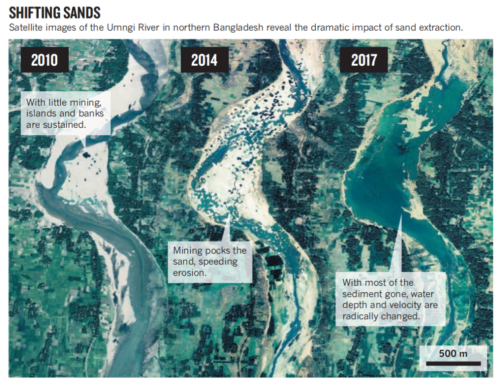 孟加拉國(guó)北部烏姆吉河的衛(wèi)星圖像顯示了采砂的巨大影響
