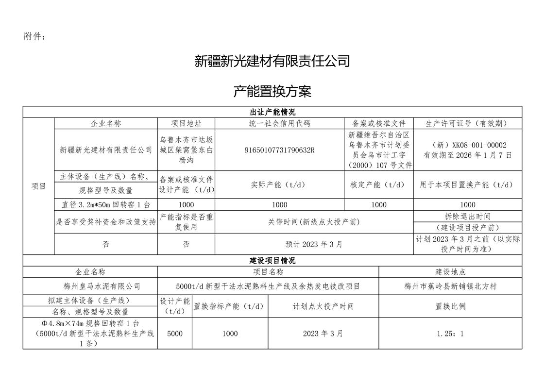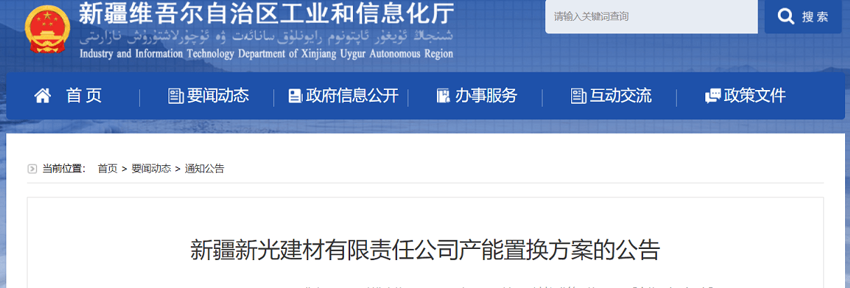 按照《國(guó)務(wù)院辦公廳關(guān)于促進(jìn)建材工業(yè)穩(wěn)增長(zhǎng)調(diào)結(jié)構(gòu)增效益的指導(dǎo)意見(jiàn)》(國(guó)辦發(fā)〔2016〕34號(hào))、《工業(yè)和信息化部關(guān)于印發(fā)鋼鐵水泥玻璃行業(yè)產(chǎn)能置換實(shí)施辦法的通知》(工信部原〔2017〕337號(hào))、《工業(yè)和信息化部辦公廳國(guó)家發(fā)展改革委辦公廳關(guān)于嚴(yán)肅產(chǎn)能置換嚴(yán)禁水泥平板玻璃行業(yè)新增產(chǎn)能的通知》(工信廳聯(lián)原〔2018〕57號(hào))、《水泥玻璃行業(yè)產(chǎn)能置換實(shí)施辦法操作問(wèn)答》要求,新疆維吾爾自治區(qū)工信廳于2021年6月1日至6月9日對(duì)《新疆新光建材有限責(zé)任公司產(chǎn)能置換方案》進(jìn)行了公示,公示期間異議問(wèn)題已得到處理。現(xiàn)將《新疆新光建材有限責(zé)任公司產(chǎn)能置換方案》予以公告,置換項(xiàng)目的生產(chǎn)線在新建項(xiàng)目投產(chǎn)前需完成拆除。