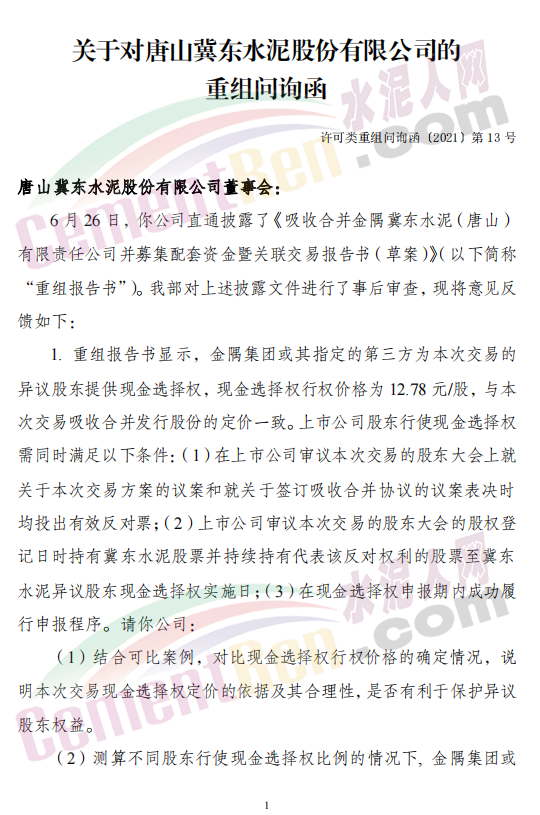 7月6日,冀東水泥上市公司收到深交所上市公司管理一部發(fā)來的《關(guān)于對(duì)唐山冀東水泥股份有限公司的重組問詢函》(以下簡(jiǎn)稱“問詢函”)。問詢函提到6月26日,冀東水泥上市公司披露了《吸收合并金隅冀東水泥(唐山)有限責(zé)任公司并募集配套資金暨關(guān)聯(lián)交易報(bào)告書(草案)》。深交所要求公司結(jié)合可比案例,對(duì)比現(xiàn)金選擇權(quán)行權(quán)價(jià)格的確定情況,說明本次交易現(xiàn)金選擇權(quán)定價(jià)的依據(jù)及其合理性,是否有利于保護(hù)異議股東權(quán)益;測(cè)算不同股東行使現(xiàn)金選擇權(quán)比例的情況下,金隅集團(tuán)或其指定的第三方需支付的現(xiàn)金及其履約能力,及冀東水泥公司在本次交易前后股權(quán)結(jié)構(gòu)變化情況。