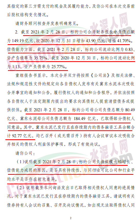 重組報(bào)告書顯示,本次合并雙方將按照《公司法》及相關(guān)法律、法規(guī)和規(guī)范性文件的規(guī)定向各自債權(quán)人發(fā)布有關(guān)冀東水泥本次吸收合并事宜的通知和公告,履行債權(quán)人的通知和公告程序,并依法按照各自債權(quán)人于法定期限內(nèi)提出的要求向其債權(quán)人提前清償債務(wù)或提供擔(dān)保。截至2021年2月28日,標(biāo)的公司母公司負(fù)債總額為80.49億元、冀東水泥母公司負(fù)債總額為184.49億元,已取得部分債權(quán)人同意函。其中,冀東水泥已發(fā)行且在存續(xù)期內(nèi)的債務(wù)融資工具余額合計(jì)92.77億元,均已召開(或無需召開)持有人會(huì)議審議本次吸收合并相關(guān)的債權(quán)人利益保護(hù)事項(xiàng),形成了有效決議。請(qǐng)公司: