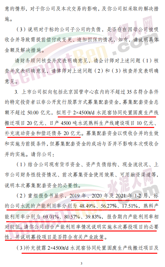 上市公司擬向包括北京國管中心在內(nèi)的不超過35名符合條件的特定投資者以非公開發(fā)行股票方式募集配套資金,募集配套資金總額不超過50.00億元,擬用于2×4500t/d水泥窯協(xié)同處置固廢生產(chǎn)線搬遷項(xiàng)目20億元、日產(chǎn)4500噸水泥熟料生產(chǎn)線建設(shè)項(xiàng)目10億元、補(bǔ)充流動(dòng)資金和償還債務(wù)20億元。募集配套資金以吸收合并的生效和實(shí)施為前提條件,但募集配套資金的成功與否并不影響本次吸收合并的實(shí)施。請(qǐng)公司: