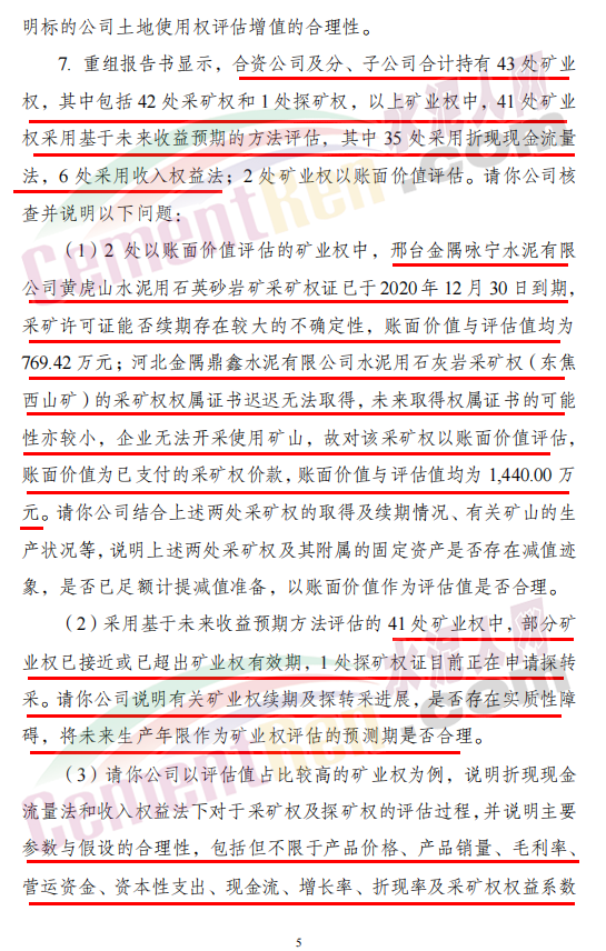 (1)兩處以賬面價(jià)值評(píng)估的礦業(yè)權(quán)中,邢臺(tái)金隅詠寧水泥有限公司黃虎山水泥用石英砂巖礦采礦權(quán)證已于2020年12月30日到期,采礦許可證能否續(xù)期存在較大的不確定性,賬面價(jià)值與評(píng)估值均為769.42萬元;河北金隅鼎鑫水泥有限公司水泥用石灰?guī)r采礦權(quán)(東焦西山礦)的采礦權(quán)權(quán)屬證書遲遲無法取得,未來取得權(quán)屬證書的可能性亦較小,企業(yè)無法開采使用礦山,故對(duì)該采礦權(quán)以賬面價(jià)值評(píng)估,賬面價(jià)值為已支付的采礦權(quán)價(jià)款,賬面價(jià)值與評(píng)估值均為1,440.00萬元。