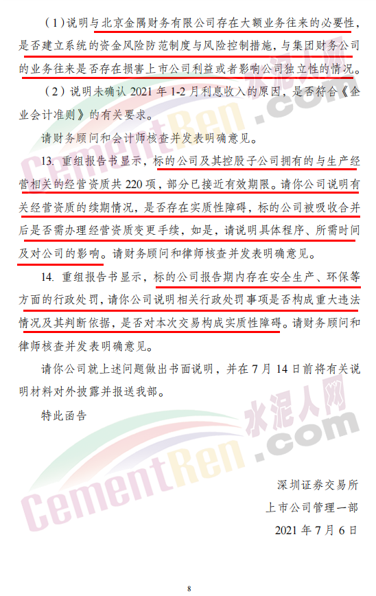 請(qǐng)公司就上述問題做出書面說明,并在7月14日前將有關(guān)說明材料對(duì)外披露并報(bào)送深交所上市公司管理一部?!蛾P(guān)于對(duì)唐山冀東水泥股份有限公司的重組問詢函》全文如下: