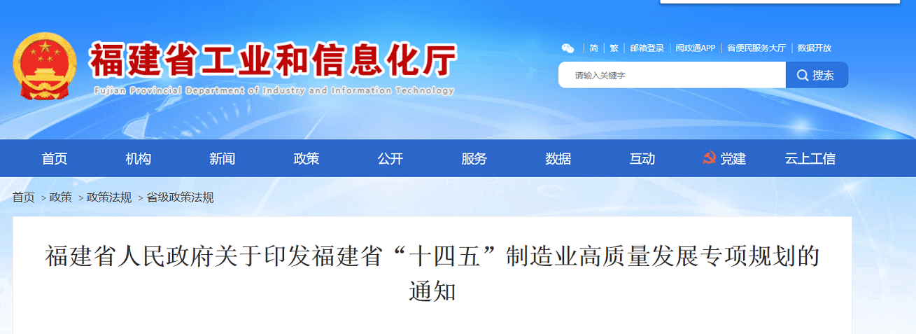 7月7日,福建省發(fā)布“十四五”制造業(yè)高質(zhì)量發(fā)展專項(xiàng)規(guī)劃。