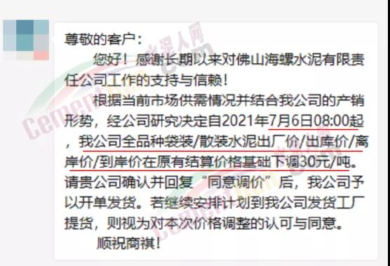 水泥人網(wǎng)信息中心消息,日前廣東省佛山海螺水泥通知:自2021年7月6日8時起,全品種袋裝/散裝水泥出廠價/出庫價/離岸價/到岸價在原有結算價格基礎下調(diào)30元/噸。