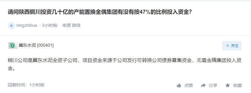 7月7日有投資者在深交所互動(dòng)平臺(tái)向冀東水泥上市公司提問(wèn)陜西銅川投資幾十億的產(chǎn)能置換金隅集團(tuán)有沒(méi)有按47%的比例投入資金?