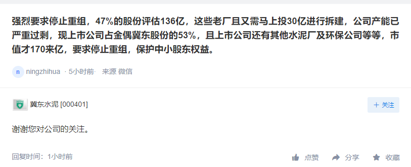 同日有投資者表示,強(qiáng)烈要求停止重組,47%的股份評(píng)估136億,這些老廠且又需馬上投30億進(jìn)行拆建,公司產(chǎn)能已嚴(yán)重過(guò)剩,現(xiàn)上市公司占金隅冀東股份的53%,且上市公司還有其他水泥廠及環(huán)保公司等等,市值才170來(lái)億,要求停止重組,保護(hù)中小股東權(quán)益。