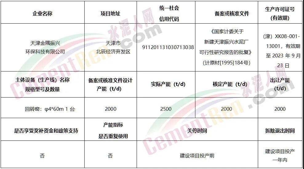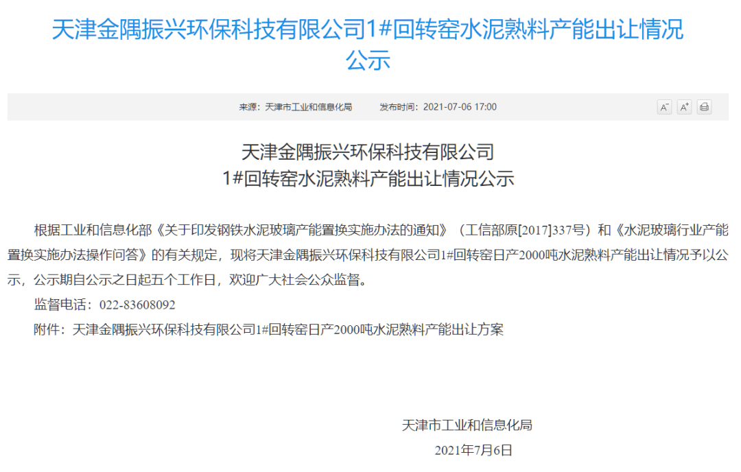 日前,天津市工業(yè)和信息化局發(fā)布《天津金隅振興環(huán)保科技有限公司1#回轉(zhuǎn)窯水泥熟料產(chǎn)能出讓情況公示》,將天津金隅振興環(huán)??萍加邢薰?000t/d水泥熟料產(chǎn)能將出讓至華潤水泥(封開)有限公司。