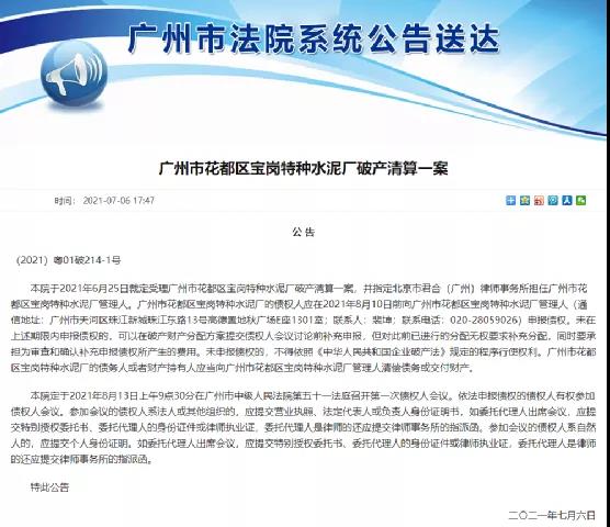 7月6日廣州市法院發(fā)布公告稱已于6月25日裁定受理廣州市花都區(qū)寶崗特種水泥廠破產(chǎn)清算一案,并指定北京市君合(廣州)律師事務(wù)所擔(dān)任廣州市花都區(qū)寶崗特種水泥廠管理人。債權(quán)人需在8月10日前向廣州市花都區(qū)寶崗特種水泥廠管理人申報(bào)債權(quán)。