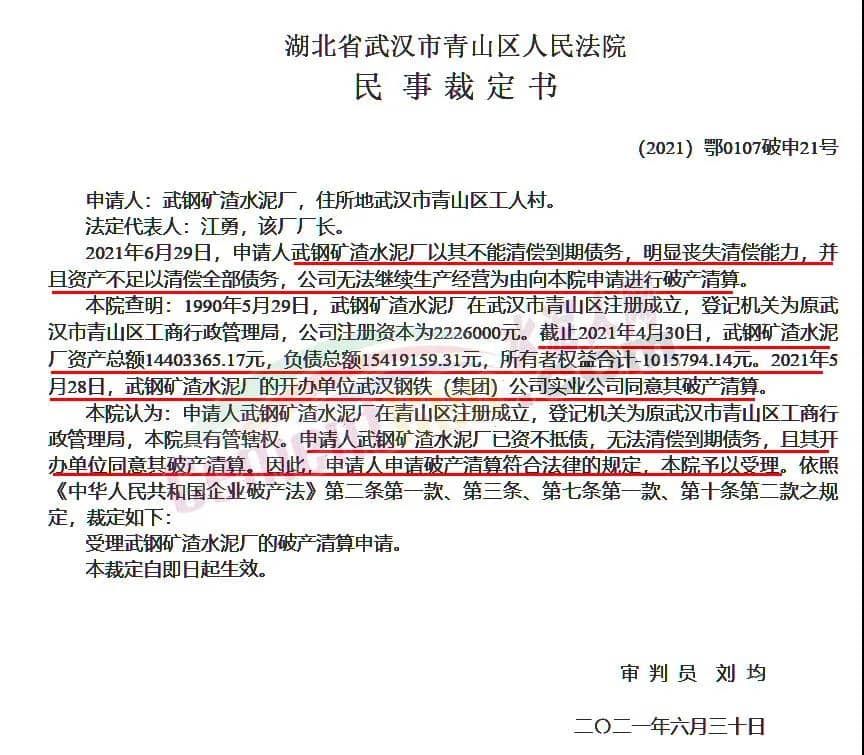 6月29日,申請(qǐng)人武鋼礦渣水泥廠以其不能清償?shù)狡趥鶆?wù),明顯喪失清償能力,并且資產(chǎn)不足以清償全部債務(wù),公司無(wú)法繼續(xù)生產(chǎn)經(jīng)營(yíng)為由向法院申請(qǐng)進(jìn)行破產(chǎn)清算。截止2021年4月30日,武鋼礦渣水泥廠資產(chǎn)總額約1440萬(wàn),負(fù)債總額約1542萬(wàn)元,所有者權(quán)益合計(jì)約-101.58萬(wàn)元。2021年5月28日,武鋼礦渣水泥廠的開辦單位武漢鋼鐵(集團(tuán))公司實(shí)業(yè)公司同意其破產(chǎn)清算。