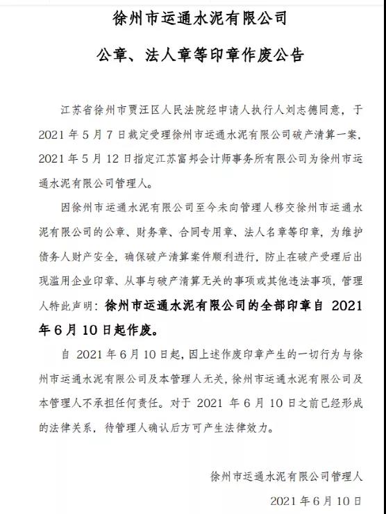 6月10日徐州市運(yùn)通水泥有限公司管理人公告,江蘇省徐州市賈汪區(qū)人民法院經(jīng)申請(qǐng)人執(zhí)行人劉志德同意,于5月7日裁定受理徐州市運(yùn)通水泥有限公司破產(chǎn)清算一案,并于5月12日指定江蘇富邦會(huì)計(jì)師事務(wù)所有限公司為徐州市運(yùn)通水泥有限公司管理人。因徐州市運(yùn)通水泥有限公司至今未向管理人移交徐州市運(yùn)通水泥有限公司的相關(guān)證照和印章,管理人聲明徐州市運(yùn)通水泥有限公司的全部印章作廢。