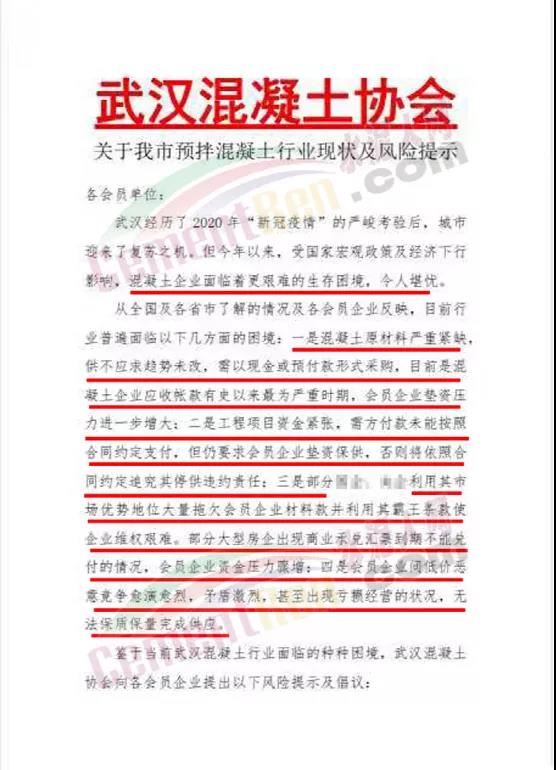 鑒于當(dāng)前武漢混凝土行業(yè)面臨的種種困境,武漢混凝土協(xié)會(huì)向各會(huì)員企業(yè)提出以下風(fēng)險(xiǎn)提示及倡議∶