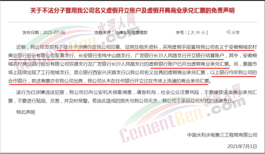 日前,中國水利水電第三工程局有限公司發(fā)布《關(guān)于不法分子冒用我公司名義虛假開立賬戶及虛假開具商業(yè)承兌匯票的免責(zé)聲明》稱,近期公司發(fā)現(xiàn)有不法分子涉嫌偽造中國水利水電第三工程局有限公司印章、證照及相關(guān)資料,采用虛假手段冒用中國水利水電第三工程局有限公司名義于開立銀行結(jié)算賬戶。并有部分虛假銀行賬戶已開出虛假商業(yè)承兌匯票。且公司從未在任何銀行開立過在市場(chǎng)上流通的商業(yè)承兌匯票。
